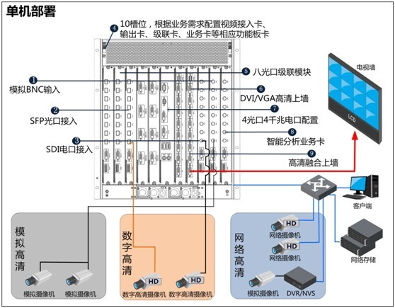 針對小規(guī)模的應(yīng)用,部署單臺設(shè)備,實現(xiàn)高清、標(biāo)清視頻的接入、編碼、存儲、顯示、業(yè)務(wù)應(yīng)用等。單機模式支持大80路HD-SDI和40路IPC HD信號同時輸入或者支持大320路模擬D1和160路IPC D1信號同時輸入,單機支持大160路高清輸出。