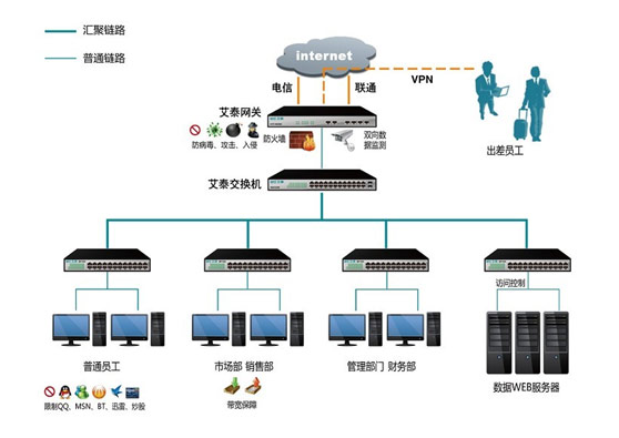 隨著網(wǎng)絡(luò)中各類熱門應(yīng)用的頻繁出現(xiàn),不加管控的網(wǎng)絡(luò)已經(jīng)給中小型企業(yè)帶來了不少困擾,員工上網(wǎng)聊天、炒股、在線視頻等網(wǎng)絡(luò)活動(dòng),影響了網(wǎng)絡(luò)資源,降低員工的工作效率,在一些關(guān)鍵部門,還帶來了不少的信息安全隱患。因此中小型企業(yè)在建設(shè)網(wǎng)絡(luò)的時(shí)候,需要很好的管控員工上網(wǎng)行為,成為中小型企業(yè)的首要任務(wù)。