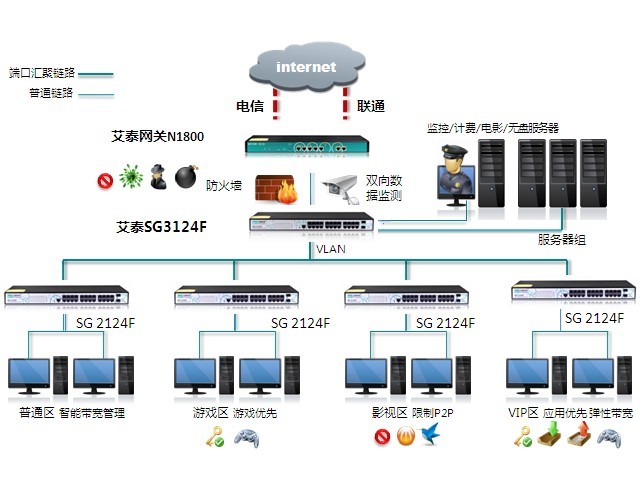 網(wǎng)吧競爭日趨激烈,網(wǎng)絡(luò)性能的好壞將直接影響顧客的滿意度和上座率,所以提高網(wǎng)絡(luò)性能將是完善網(wǎng)吧建設(shè)的第一步,所以網(wǎng)絡(luò)設(shè)備的選擇對于提供網(wǎng)吧整體性能起了決定作用。大型網(wǎng)吧和連鎖網(wǎng)吧對設(shè)備要求高,不僅功能完善,處理能力強。更需要及其穩(wěn)定并且?guī)в袀浞莨δ。簡單的網(wǎng)絡(luò)故障就有可能會造成重大損失,導致客戶滿意度下降。同時網(wǎng)絡(luò)應(yīng)用越來越復雜,視頻、語音、網(wǎng)游等應(yīng)用對延遲的要求越來越高,惡意攻擊,網(wǎng)絡(luò)病毒等現(xiàn)象普遍存在,這些都是網(wǎng)吧必須防范和解決的問題。