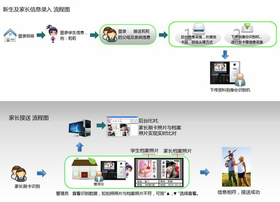 校園新生及家長(zhǎng)信息錄入: 新生入學(xué),學(xué)生與家長(zhǎng)到校務(wù)辦進(jìn)行信息采集。以本機(jī)采集為例,家長(zhǎng)信息錄入以后傳輸?shù)阶R(shí)別機(jī),然后在識(shí)別機(jī)上進(jìn)行發(fā)卡及照片采集,采集完成后,軟件進(jìn)行信息匯總,卡號(hào)及照片存入數(shù)據(jù)庫(kù)。后期可增加家長(zhǎng)信息數(shù)量,大數(shù)量為10個(gè)。