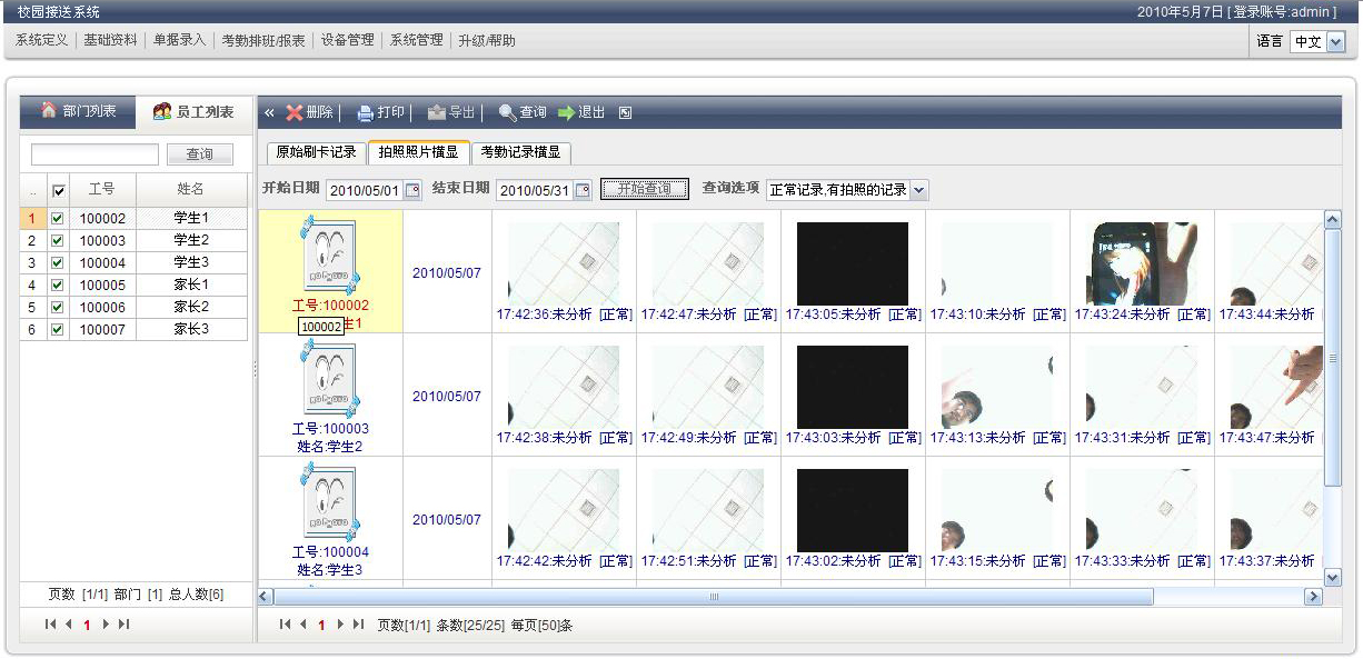家長(zhǎng)接送: 設(shè)備安裝于門衛(wèi)室旁,家長(zhǎng)進(jìn)門時(shí),首先進(jìn)行刷卡,家長(zhǎng)刷卡以后,管理員現(xiàn)場(chǎng)查看刷卡信息,比對(duì)照片,如與檔案照片不符(因小孩可能對(duì)應(yīng)多位家長(zhǎng)接送),則按“↑”與“↓”鍵,查看所屬其他家長(zhǎng)照片,查到該家長(zhǎng)照片則完成接送。 后臺(tái)管理員可實(shí)時(shí)查看刷卡數(shù)據(jù),實(shí)現(xiàn)實(shí)時(shí)查看。