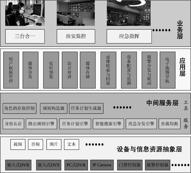 第四層為設(shè)備與信息資源抽象層,實現(xiàn)了安防設(shè)備和音視頻、圖片和文本等信息的歸納抽象,并接入到平臺進行集成管理,使用戶無需關(guān)心所使用的設(shè)備和信息資源的具體位置和形態(tài),便于設(shè)備信息資源的組織和調(diào)度,更好的為業(yè)務(wù)服務(wù)。