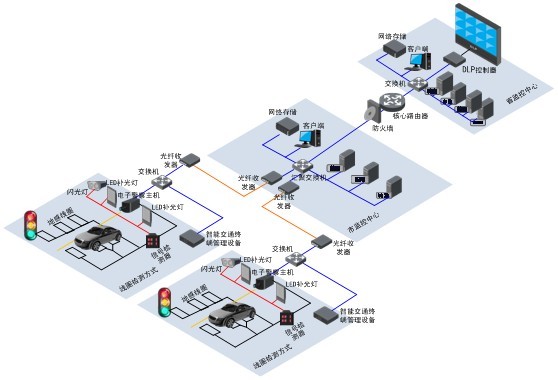整個闖紅燈自動記錄系統(tǒng)主要由前端采集子系統(tǒng)、網(wǎng)絡(luò)傳輸子系統(tǒng)和中心管理子系統(tǒng)三部分組成,系統(tǒng)整體結(jié)構(gòu)如下: