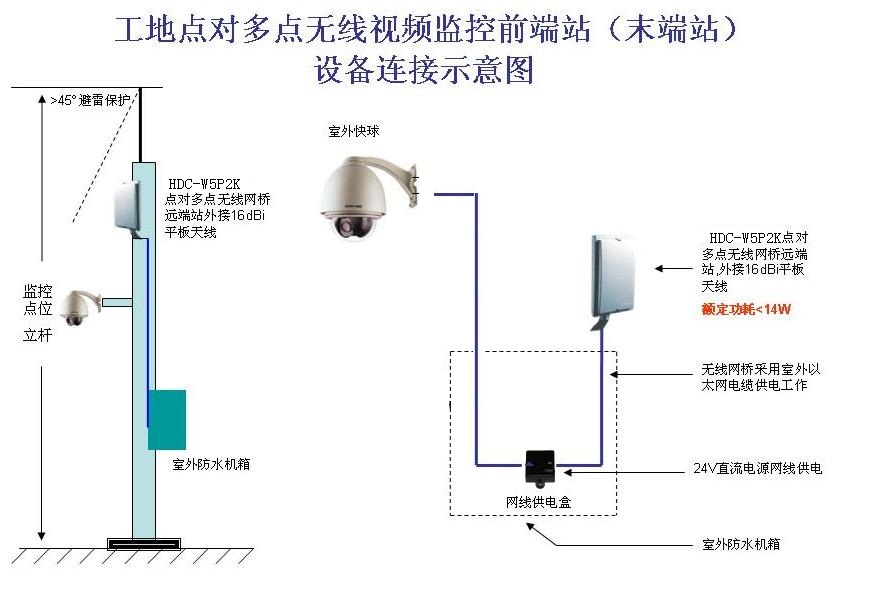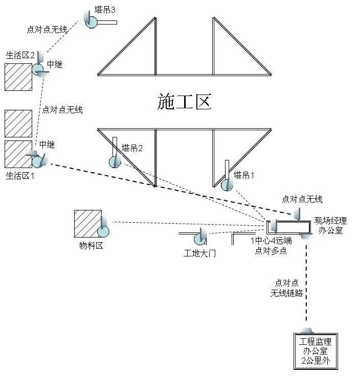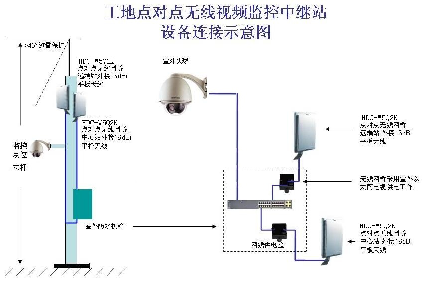 為保證某項(xiàng)目工程安全順利進(jìn)行,公司管理人員能夠及時(shí)了解施工現(xiàn)場(chǎng)情況和施工進(jìn)度,在工程現(xiàn)場(chǎng)安裝了合肥環(huán)宇智能工程有限公司的5.8GHz室外點(diǎn)對(duì)點(diǎn)、點(diǎn)對(duì)多點(diǎn)無(wú)線視頻監(jiān)控系統(tǒng),該系統(tǒng)由合肥監(jiān)控公司環(huán)宇智能的點(diǎn)對(duì)點(diǎn)、點(diǎn)對(duì)多點(diǎn)無(wú)線網(wǎng)橋和200W網(wǎng)絡(luò)高速球組成。