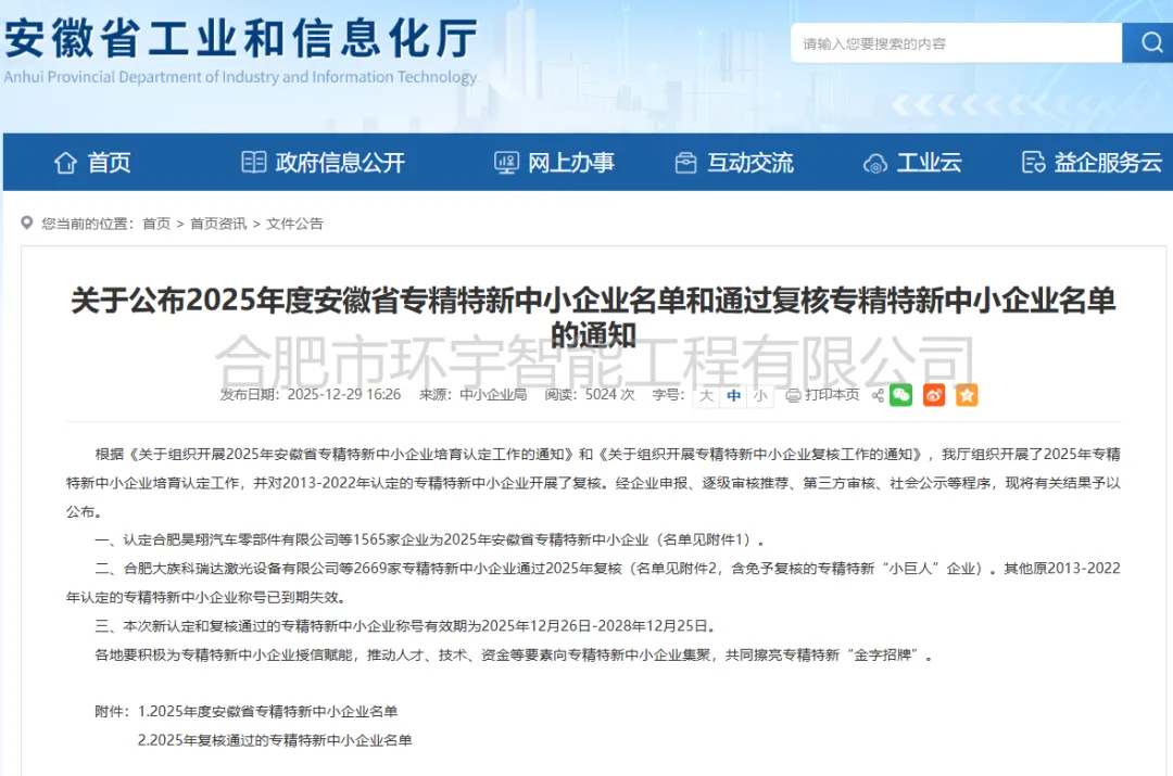 根據(jù)安徽省工信廳發(fā)布的通知,本次新認(rèn)定企業(yè)稱號有效期為2025年12月26日至2028年12月25日。入選企業(yè)將在政策扶持、融資服務(wù)、人才引進(jìn)、市場開拓等方面獲得更多支持,進(jìn)一步推動企業(yè)成長。