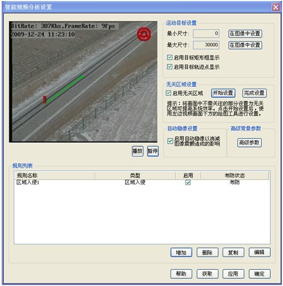 同時,鐵路上防止人或動物在鐵軌區(qū)逗留,要求必須能具備智能分析的越界、進(jìn)入及徘徊功能的檢測。